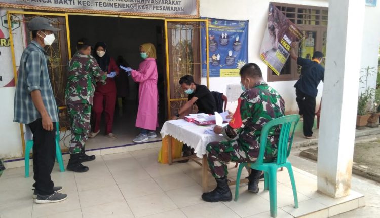 Pelaksanaan serbuan Vaksin Covid – 19 Kodim 0421/LS tahap pertama di Balai Desa Panca Bakti Kecamatan Tegineneng Kabupaten Pesawaran, Lampung, Sabtu pagi (02/10/2021) berjalan dengan aman dan tetap mematuhi protokol kesehatan.