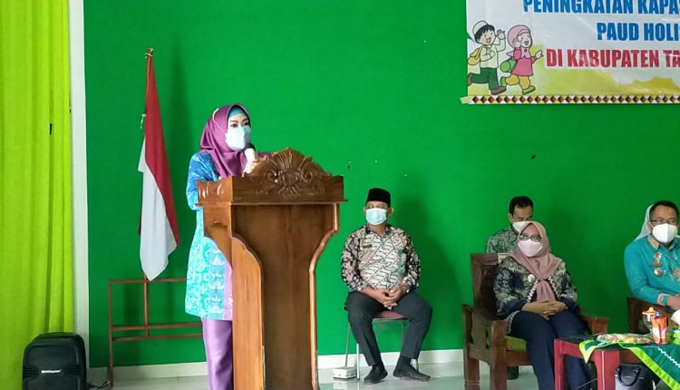 Hj.Dewi Handajani selaku Bunda PAUD Kabupaten Tanggamus yang membuka kegiatan ini mengatakan bahwa pengembangan anak usia dini holistik integratif adalah upaya pengembangan anak usia dini yang dilakukan untuk memenuhi kebutuhan esensial anak yang beragam dan saling terkait secara simultan, sistematis dan berintegrasi. Simultan dipahami sebagai kebijakan terhadap anak usia dini yang mencakup kesehatan, pendidikan, perlindungan dan pengasuhan secara bersamaan.