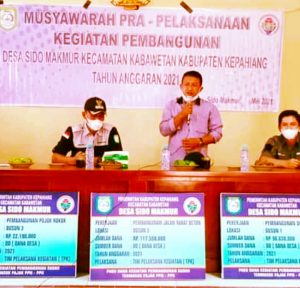 Wiwid selaku kepala Desa Sido Makmur dalam sambutan nya mengatakan Desa Sidomakmur Kecamatan Kabawetan telah melaksanakan Musyawarah Pra Pelaksanaan Kegiatan Pembangunan Tahun Anggaran 2021, Jum’at (04/06/21).