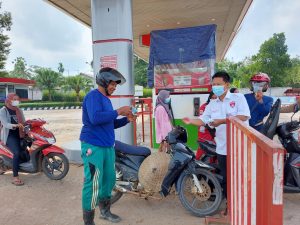 SPBU 24.345.18 Tiuh Balak,Baradatu Mengandeng Polsek Baradatu Peduli Pencegahan Covid 19 Dengan Berbagi 1000 Maskers Gratis