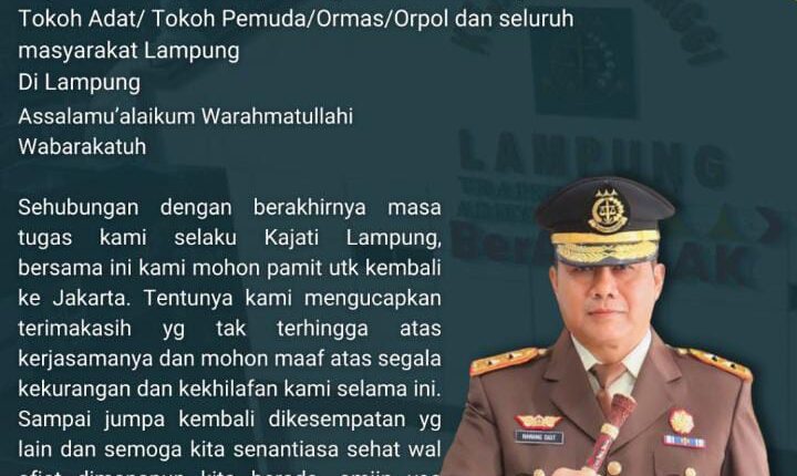 ” Kepada Yth. Bapak/Ibu para Pejabat/ Tokoh masyarakat/ Tokoh Adat/ Tokoh Pemuda/Ormas/Orpol dan seluruh masyarakat Lampung. Assalamualaikum warahmatullahi wabarokatuh. Sehubungan dengan berakhirnya masa tugas kami selaku Kajati Lampung, bersama ini kami mohon pamit untuk kembali ke Jakarta, “katanya.
