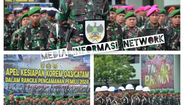 Mi-Net.com – Bertempat di lapangan apel Makorem 043/Gatam Jl. Teuku Umar Penengahan Bandar Lampung, tiga matra TNI Wilayah Provinsi Lampung (TNI-AD, TNI-AL dan TNI-AU) mengikuti apel gelar pasukan pengamanan Pemilu Tahun 2024 yang tersebar di seluruh jajaran TNI secara virtual dengan Panglima TNI Jenderal TNI Agus Subiyanto, S.E., M.Si, pada Kamis (1/2/2024).