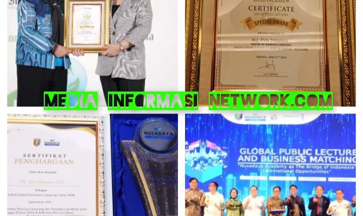 Di wakili oleh Plt. Asisten Bidang Pemerintahan dan Kesejahteraan rakyat, Ir.Maidasari, M.M, Walikota Bandar Lampung Hj.Eva Dwiana mendapatkan sertifikat penghargaan sebagai Tokoh peduli pariwisata Lampung Tahun 2024, yang di putuskan oleh Dinas Pariwisata Provinsi Lampung dan Nusadaya Academy.