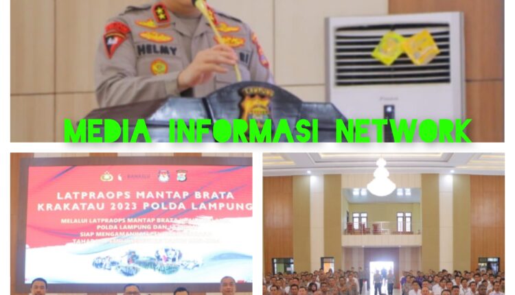 Lampung Selatan (MIN) – Polda Lampung melaksanakan Latpra Ops Mantap Brata Tahun 2023 dalam rangka pengamanan tahapan pemilu serentak yang akan dilaksanakan tahun 2023-2024, Bertempat di Gedung Serba Guna (GSG) Presisi Polda Lampung. Selasa (10/10/23)