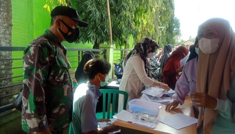 Pelaksanaan serbuan Vaksin Covid – 19 Kodim 0421/LS Dosis I di Puskesmas Trimulyo yang masuk dalam Wilayah Pos Ramil Tegineneng, Kecamatan Tegineneng Kabupaten Pesawaran, Lampung, Sabtu pagi (25/09/2021) berjalan dengan aman dan tetap mematuhi protokol kesehatan.
