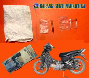 Setelah diamankan disertai dengan penggeledahan terhadap badan,pakaian dan sepeda motor hasilnya diketemukan uang tunai sebesar Rp 100 ribu rupiah pada RM dan didalam bagasi dibawah jok sepeda motor ditemukan berupa bungkusan tissue didalamnya terdapat 1 (satu) bungkus plastik klip bening ukuran kecil yang berisikan kristal putih berwarna putih diduga Narkotika jenis sabu berat bruto sekira 0,25 gram.